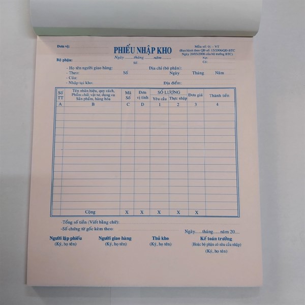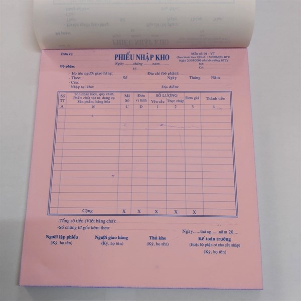 - - Là sản phẩm được in trên loại giấy ford và giấy carbon 2 liên khổ A4 20x25cm, ban hành theo QĐ số 15/2006/QĐ-BTC ngày 20/3/2006 của Bộ trưởng Bộ Tài Chính, giúp ghi lưu đầy đủ thông tin trong công việc nhập hàng hóa ra khỏi kho.